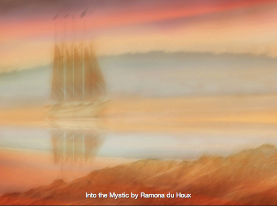 In Into the Mystic a schooner looks like it approaching under full sail from another world.