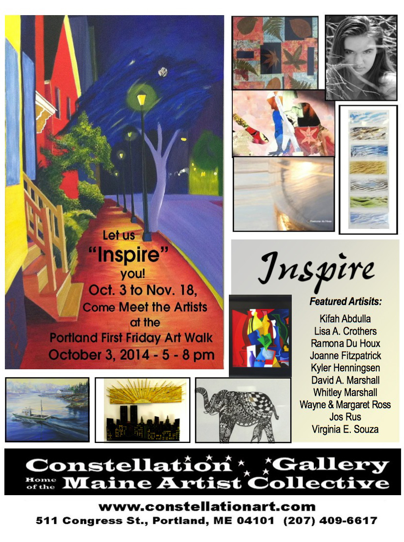 The Constellation Gallery located at 511 Congress Street is open Monday 12-4 pm, Wednesday 1-5 pm, Friday 12-4 pm and Sunday 10-2 pm. The Gallery is also by appointment. Please call 409.6617.
