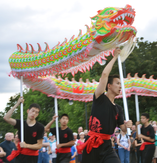 The Dragon Dance was performed at the American Folk Festival held in Bangor, Maine last August. It is a major part of Chinese New Year and will be enacted around the world today. The troupe came from Boston and mesmerized the audience. Photo by Ramona du Houx