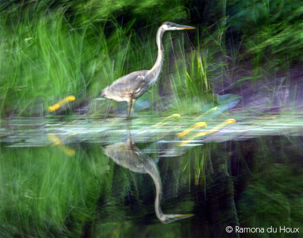The river always welcomed me like an old friend who never ages. I sank into a rock formation and hid my head between my legs, taking deep calming breaths. With a swooshing sound overhead, and a breeze on my neck, I looked up just as the heron landed on a rock not twelve feet away. I didn’t dare move as she inched closer going about her business, apparently ignoring me. Every one of her movements had a purpose, making me realize how cluttered and unreasoned many of my everyday motions were. Each of her steps were calculated to be nearly undetectable in the underwater world. After transforming into a statue, she’d wait for her prey to reveal itself in the opportune striking spot. This time she stood frozen for well over twenty minutes, before she filled her belly.